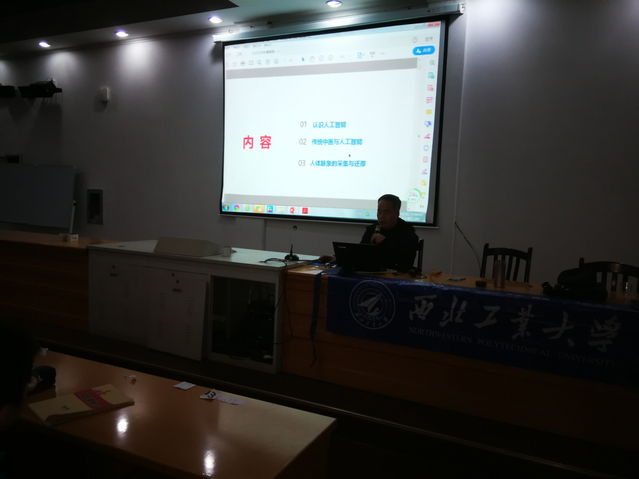 的视频宣传片、并向学生简要介绍了西工大的特色。在科普报告中,主要结合他负责的科研小组最新的科研项目“远程智慧切脉系统”,首先介绍了人工智能的概念、研究内容以及应用领域;然后介绍了如何用人工智能模式采集与分析中医四诊(望、闻、问、切)的数据,以提高中医远程诊疗的精准度,从而有望复活古代中医传说中的“悬丝诊脉”;最后向同学们介绍了研制“远程智慧切脉仪”样机过程中需要的创新思维、拼搏精神和团队意识,并展示了部分科研过程中的照片,以激发中学生的学习兴趣。