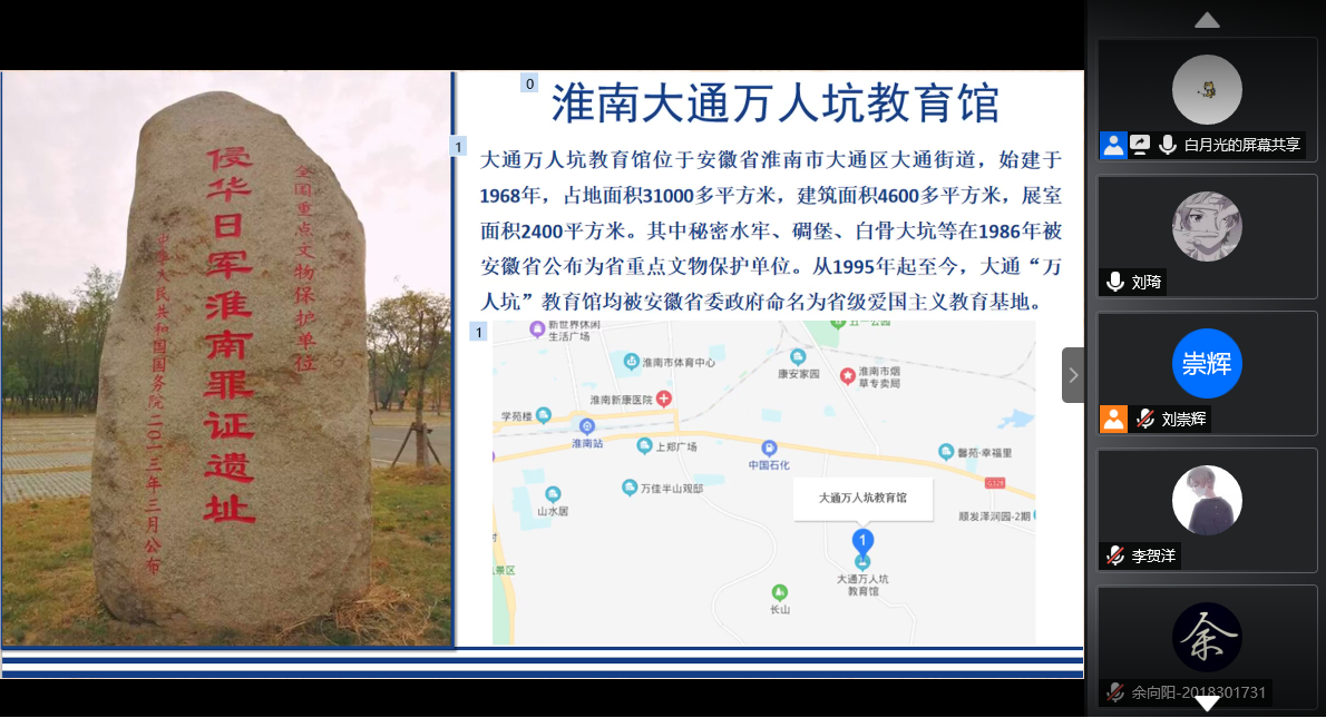 接下来,同学们参观了皖南事变烈士陵园和淮南大通万人坑教育馆。皖南事变是震惊中外的国民党第二次反共高潮的高峰,有大批的共产党员惨死在国民党反动派的屠刀下。而淮南大通万人坑是日寇侵占大通煤矿后,施行了惨无人道的法西斯统治,采取“以人换煤”的方式,迫使广大矿工在极其危险、简陋的工作和生活环境下工作。因为环境恶劣,成千上万的无辜劳工含恨死去。日寇及其走狗,为了掩人耳目,挖了大坑填埋尸体。大通万人坑是日本发动侵略战争在我国犯下滔天罪行的历史铁证。同学们听到这里,无一不为日本军国主义和国民党反动派的野蛮残酷而愤慨。