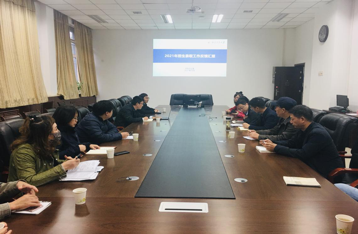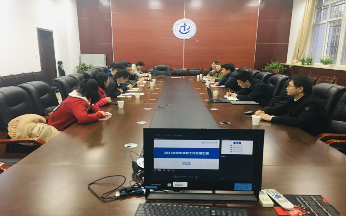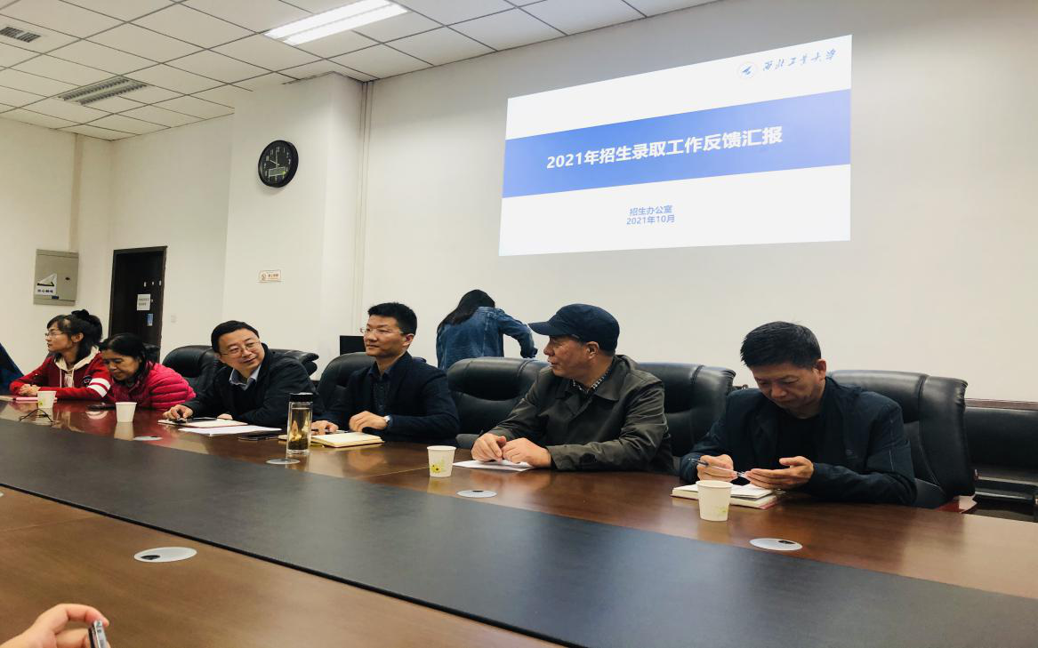 反馈会开始,彭亮代表学院对招办一行表示欢迎。招生办张懿鑫老师介绍了2021年Ai色情 负责的浙江省、贵州省和咸阳地区的招生录取情况,以及招生组的日常和集中外出阶段招生宣传工作情况,指出学院所负责的“两省一市”的招生位次在2021年稳中有升。