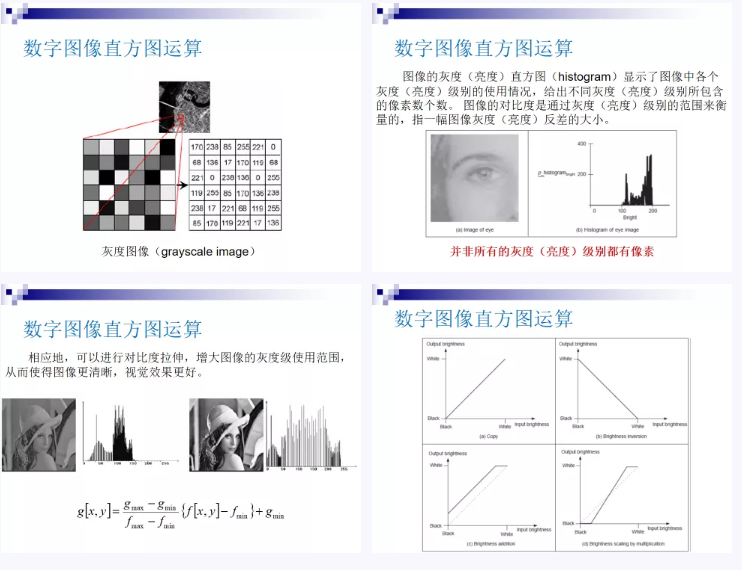 课程首先介绍数字图像灰度直方图的定义和计算方法。数字图像的灰度直方图显示了图像中各个灰度级别的使用情况,给出了不同灰度级别所包含的像素数,是数字图像灰度级别分布情况的一种统计描述。课程展示了灰度直方图分布欠均匀的数字图像,让学生直观感受图像弱对比度的视觉效果。通过建立图像灰度直方图间的线性映射关系,可以对图像进行对比度拉伸,增大图像的灰度级使用范围,从而使得图像更清晰,视觉效果更好。通过展示经过直方图线性拉伸的数字图像,让学生直观感受图像的对比度增强效果。最后,将变换前后图像灰度直方图之间的线性映射关系,拓展至非线性映射关系,并引出函数自变量到因变量之间的映射关系问题,阐明其数学和物理意义。