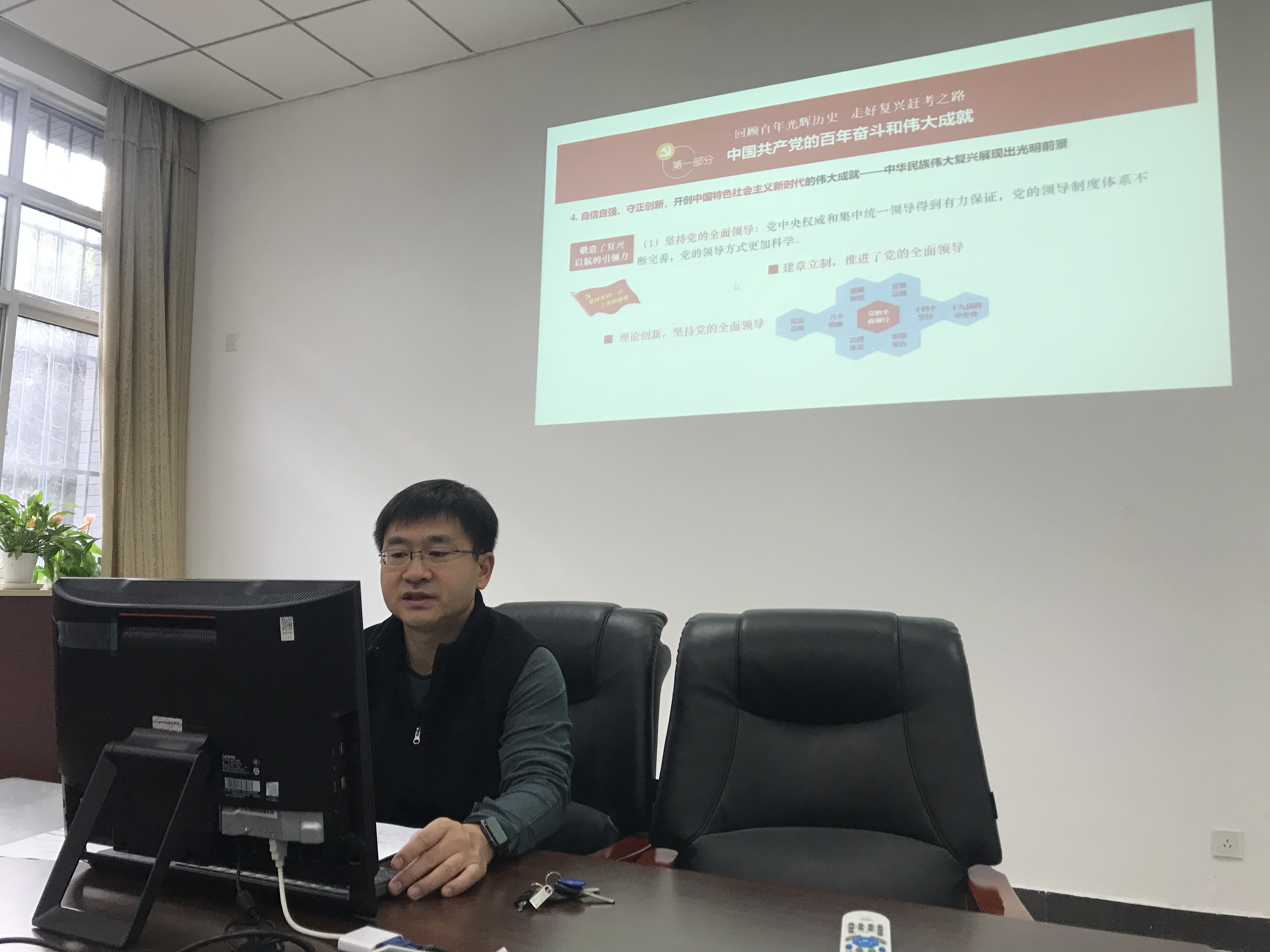 党委理论学习中心组贯彻落实党的十九届六中全会精神第三次专题学习研讨会在学院119会议室召开。学院党委书记侯俊同志为全体中心组成员讲授“回顾百年光辉历史,走好复兴赶考之路”专题党课,宣讲党的十九届六中全会精神。