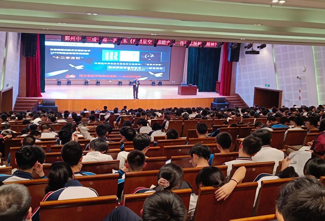 在鄞州中学报告厅,苏继东研究员为700余名高一学子做了题为《仰望星空,脚踏实地》的科普报告。他从宇宙大爆炸出发,启发师生思考:人类渺小而宇宙浩瀚,那人生价值是什么?如何实现人生价值?他提出科研道路上必不可少的四种思维,即梦想思维、创新思维、哲学思维和科学思维。他结合自身经历与切身体会就新中国七十年来的航天事业和航天精神进行讲解,重点介绍中国航天发展的三大里程碑:东方红1号、神舟5号和嫦娥1号,以及五大航天精神谱系:“航天传统精神”“两弹一星精神”“载人航天精神”“新时代北斗精神”和“探月精神”。最后,苏继东研究员鼓励同学们传承、弘扬的航天精神,立大志向、入主战场、上大舞台、干大事业。科普报告之后,高永胜和苏继东分别代表学校向鄞州中学赠送运-20飞机模型、仿蝠鲼柔体潜水器模型等礼物。
