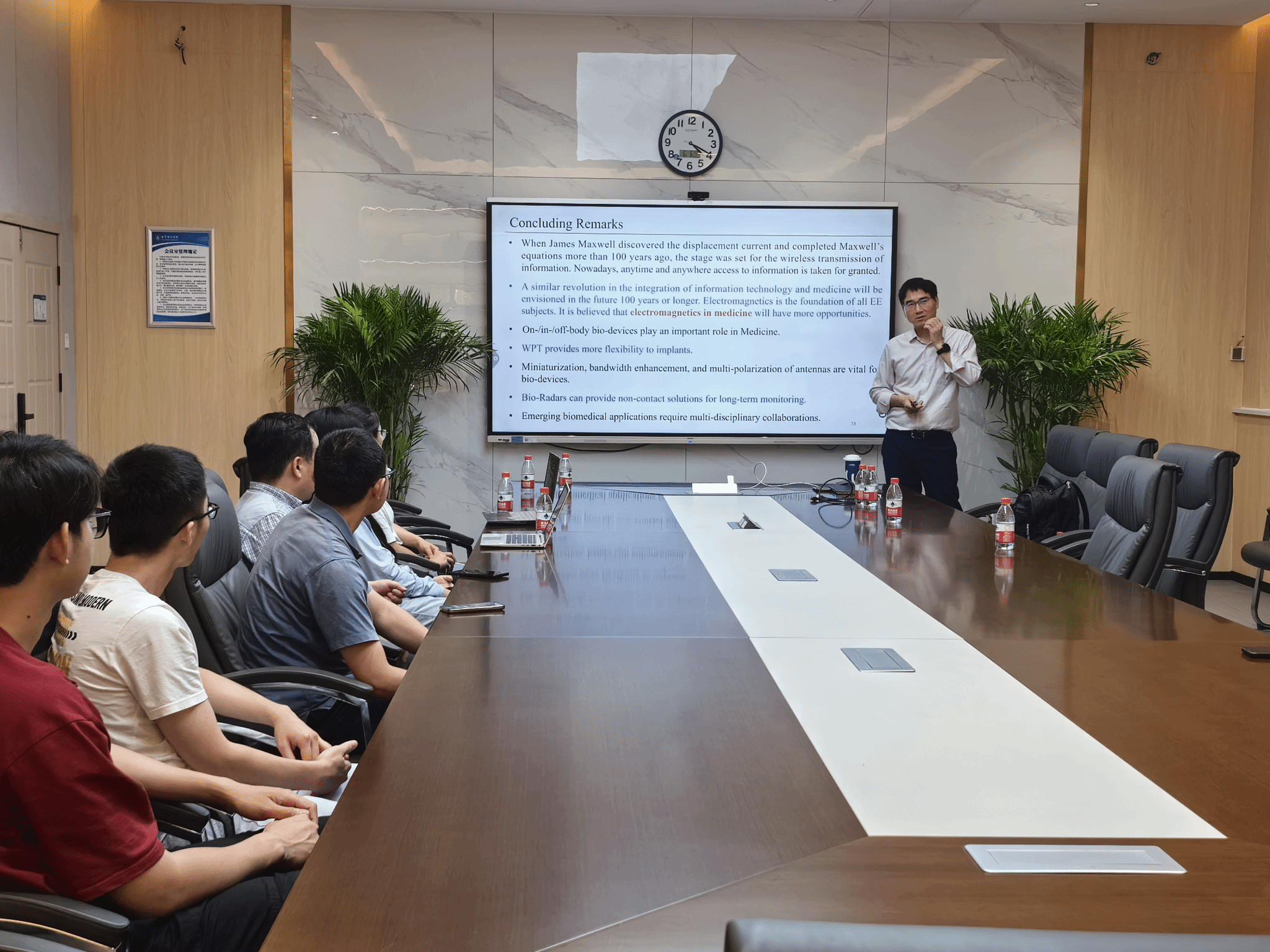 论坛伊始,张双喜对郭永新教授的到来表示了热烈欢迎,并详细介绍了其个人履历和研究方向。随后,郭教授做了题为《电磁学赋能智慧医疗:无线能量传输、天线技术、射频芯片、和无线感知的最新进展》的专题报告。郭教授介绍了可植入式无线医疗设备(IMDs)在辅助改善患者的健康监测和治疗中的应用,分享了智能无线感知与调控技术在推动智慧医疗监测、诊断和治疗取得的相关研究进展,并结合团队长期深耕的工作,重点阐述了最新应用于生物医学的射频芯片、无线输能、天线技术和无线感知等关键技术的新思路与新突破。