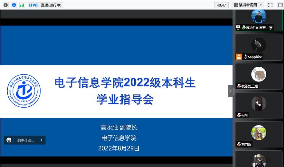 盛夏渐远,秋意愈浓,今年的开学季在绵绵的秋雨中开始,电子信息学院迎来了2022级280余名本科生。为了帮助新生更好地了解电子信息类专业的培养方案和课程体系,做好学业规划,8月29日下午,电子信息学院线上召开了2022级本科新生学业指导会。学院副院长高永胜、教务处王旭、学院2022级本科生辅导员翟伟乐和刘向阳、各班班主任、本科教学秘书何可参加了本次会议。会议由本科教学秘书杨瑾主持。