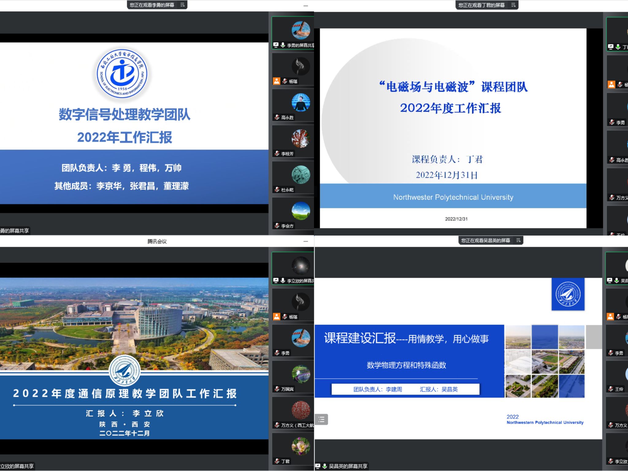 为认真学习贯彻党的二十大精神,落实学校一流本科人才培养行动计划,进一步推进基层教学组织建设,培养可持续发展的教师队伍,根据《电子信息学院教学团队建设与管理办法》文件精神,2022年12月31日,电子信息学院线上召开了首批8个本科教学团队年终考核评审会。评审会特邀材料学院副院长王永欣、航空学院副院长万方义、计算机学院副院长郭斌、电子信息学院院长王伶、副书记高敏、副院长姚如贵、张洵颖、高永胜及教师代表万国宾组成评审小组。各教学团队负责人、成员参加了本次评审会。