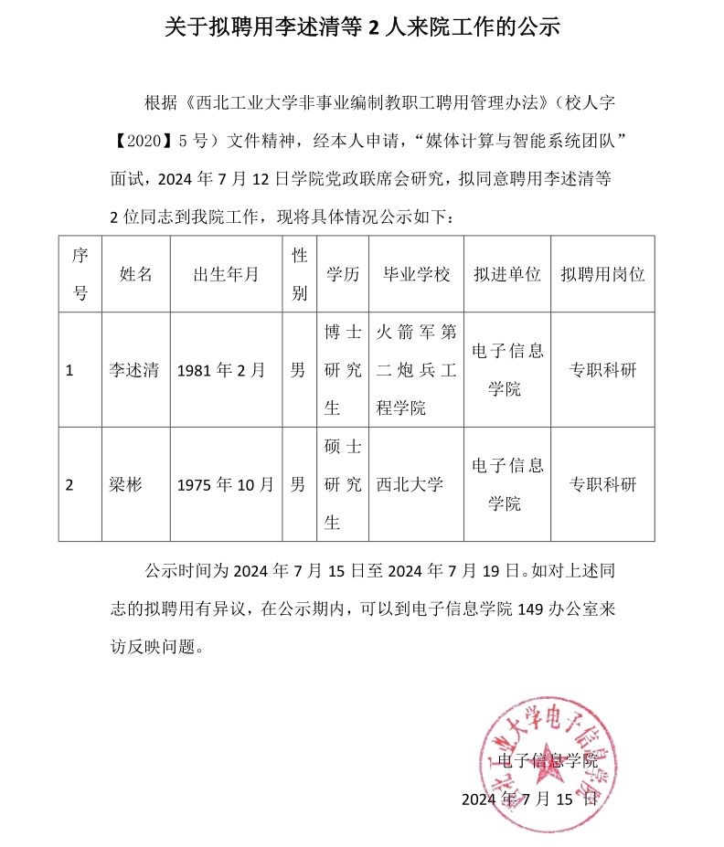 关于拟聘用李述清等2人来院工作的公示