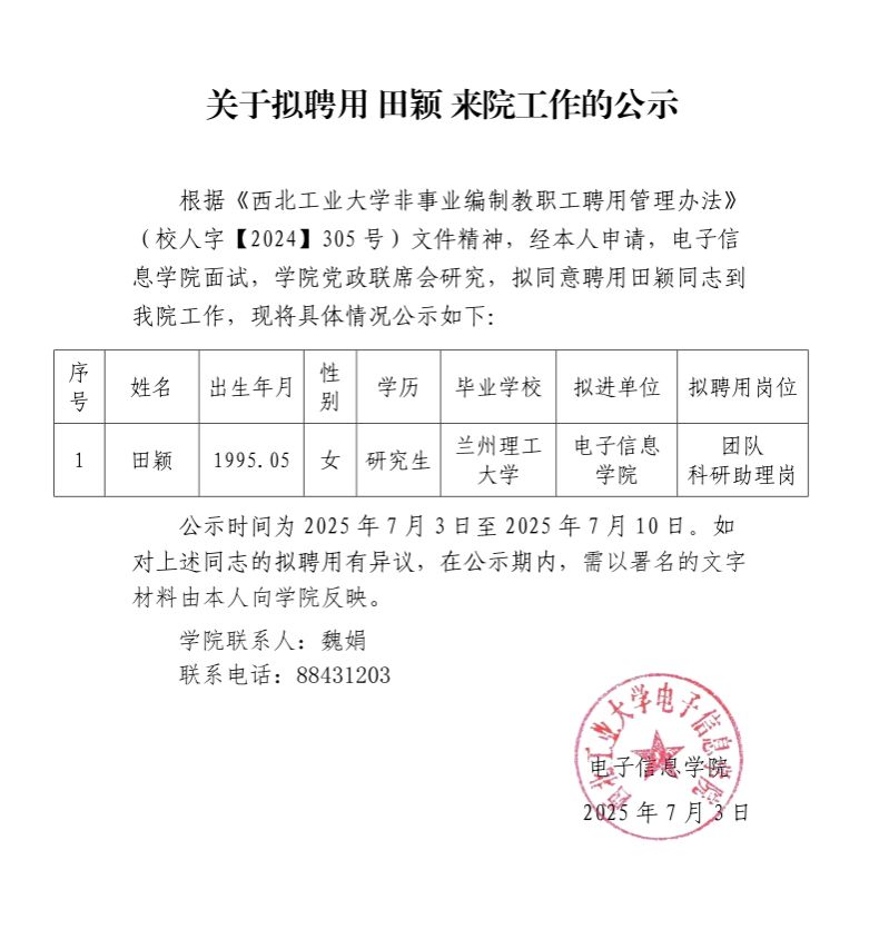 关于拟聘用 田颖 来院工作的公示