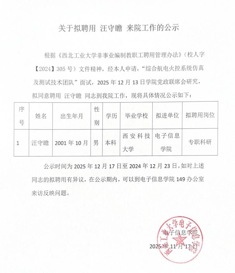 关于拟聘用汪守瞻来院工作的公示