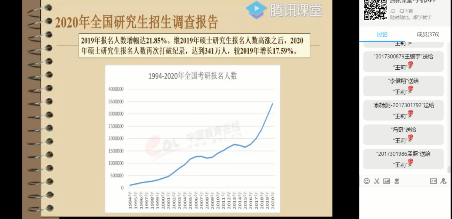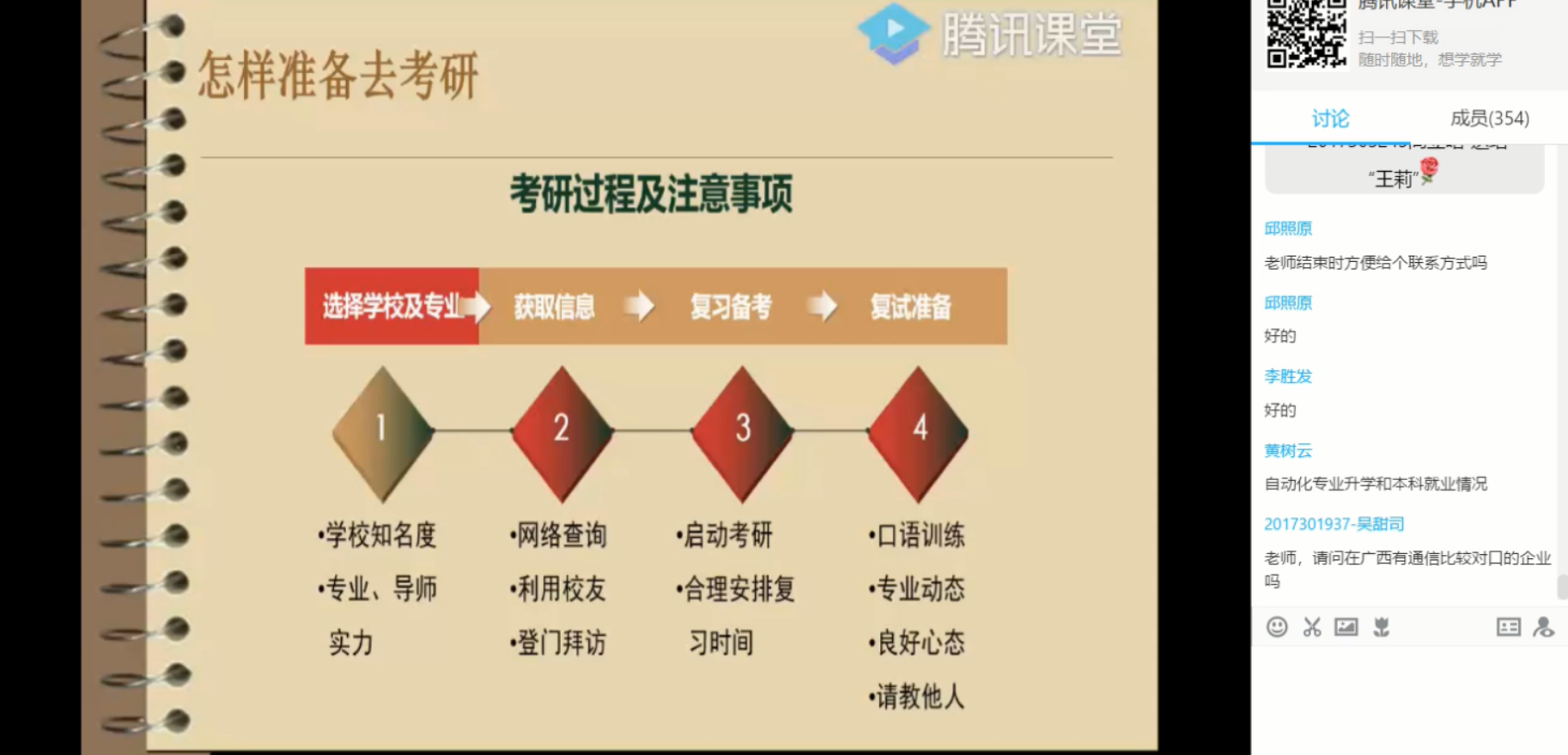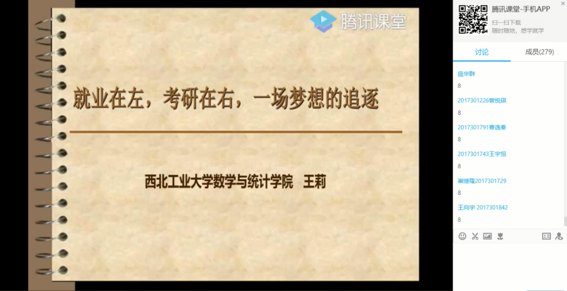 为了帮助2021届的同学们利用暑期积极调整,充分备战9月招聘黄金季。2020年8月1日晚7点,由学生职业发展指导服务中心主办,电子信息学院承办的第88期“莉莉老师聊就业”在腾讯课堂成功举办。活动邀请了深受工大学子喜爱的王莉老师为2017级本科生做了题为《就业在左,考研在右,一场梦想的追逐》的学业生涯专题辅导讲座。共有380余名同学聆听了王莉老师的精彩讲座。