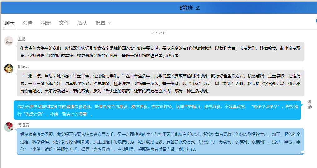 各团支部充分发挥主观能动性,就各班情况以多种形式开展活动。有的支部在线上集体观看会议并展开讨论;有的支部将个人分散学习和集体分享交流相结合;有的支部呼吁同学每日切实做到光盘行动并拍照打卡;还有的支部组织了线下主题班会,由团支书带领学习,并在班会结束后分享个人的活动感悟。