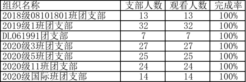 在本期学习中,本科支部18级较上期学习完成率有所提升,19级学习完成率全部超过70%;其中,共有7个班级支部学习完成率达100%,分别是:18级08101801班,19级1班和国际班(DL061991),20级3、5、11和国际班,在此对这些团支部提出表扬!