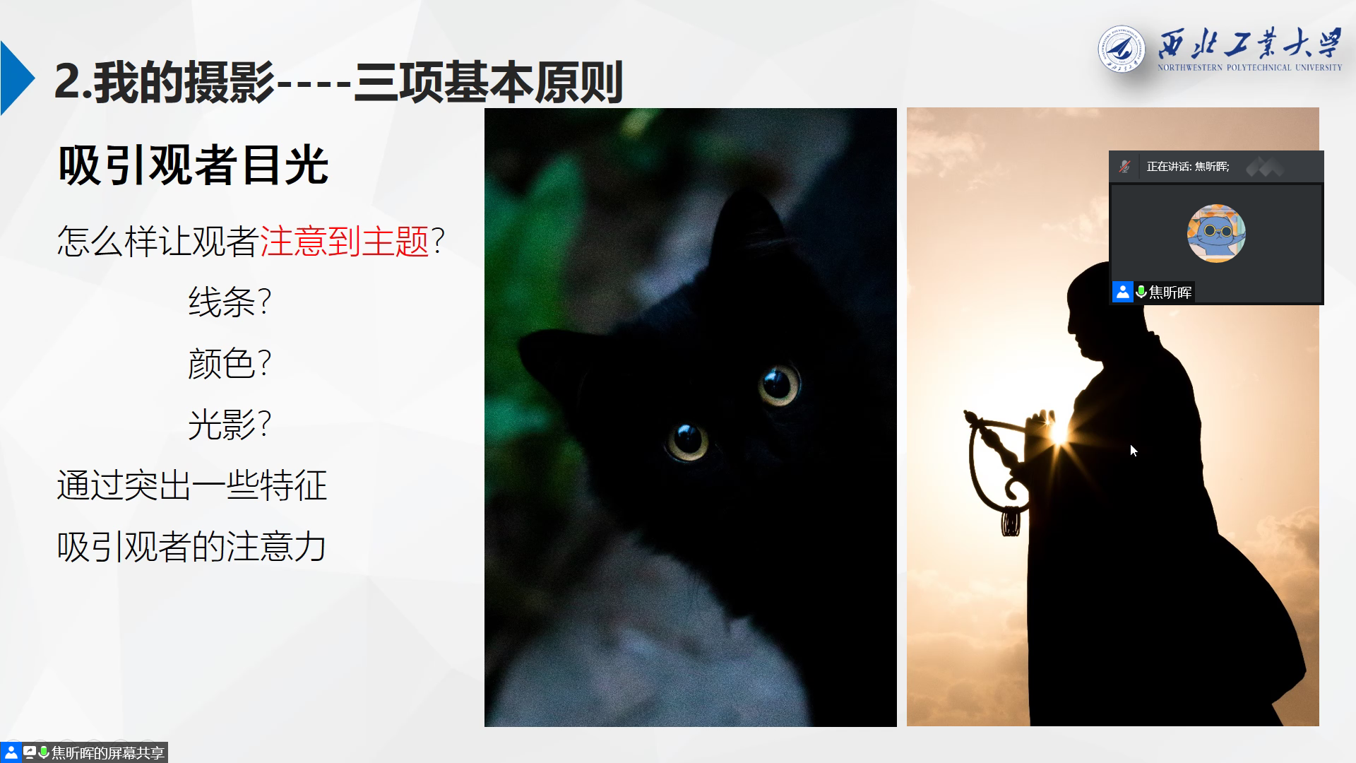 1月6日晚,由我校党委学工部主办,电子信息学院承办的“微拓”-WE TALK学术沙龙第140期以线上会议的形式举行。本次活动主题为《发现生活之美》,主讲人是电子信息学院2020级博士生焦昕晖。在本期微拓活动中,焦昕晖分享了自己在科研和生活的经历与收获,还结合自己对摄影的理解,通过实际例子介绍了如何拍摄一张具有美感的照片、如何利用镜头捕捉校园内外的精彩瞬间,并讨论了图画与摄影艺术之间的相互关系。焦昕晖的分享激发了大家对摄影的兴趣,同学们纷纷表示受益匪浅。