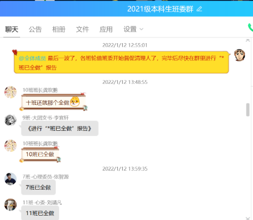 吴老师提到,他认为自己日常工作中遇到的最大困难是在封宿管理初期,年级中有一两个同学偶尔没有做核酸检测。为了解决这个问题,他组织各班每天轮值的班委在当天最后一次核酸检测的时候督促自己班级的同学,在群里报自己班的是否已全做的报告,成功达成“全员核酸,不漏检一人。”