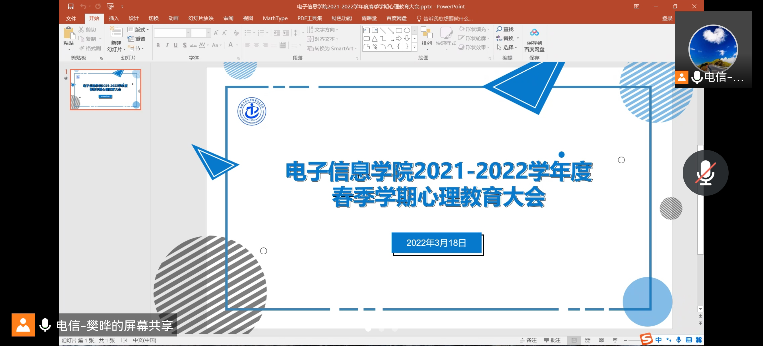 为更好的开展心理健康教育工作,帮助同学们开展正确的自我认识,调整和控制自身行为,促进同学们与他人交流,引导其解决学习生活中的实际问题,电子信息学院知心阁于3月18日、19日,面向2021级本科及硕士各班心理委员召开线上心理教育大会,并在知心阁活动室165举行开学破冰活动。