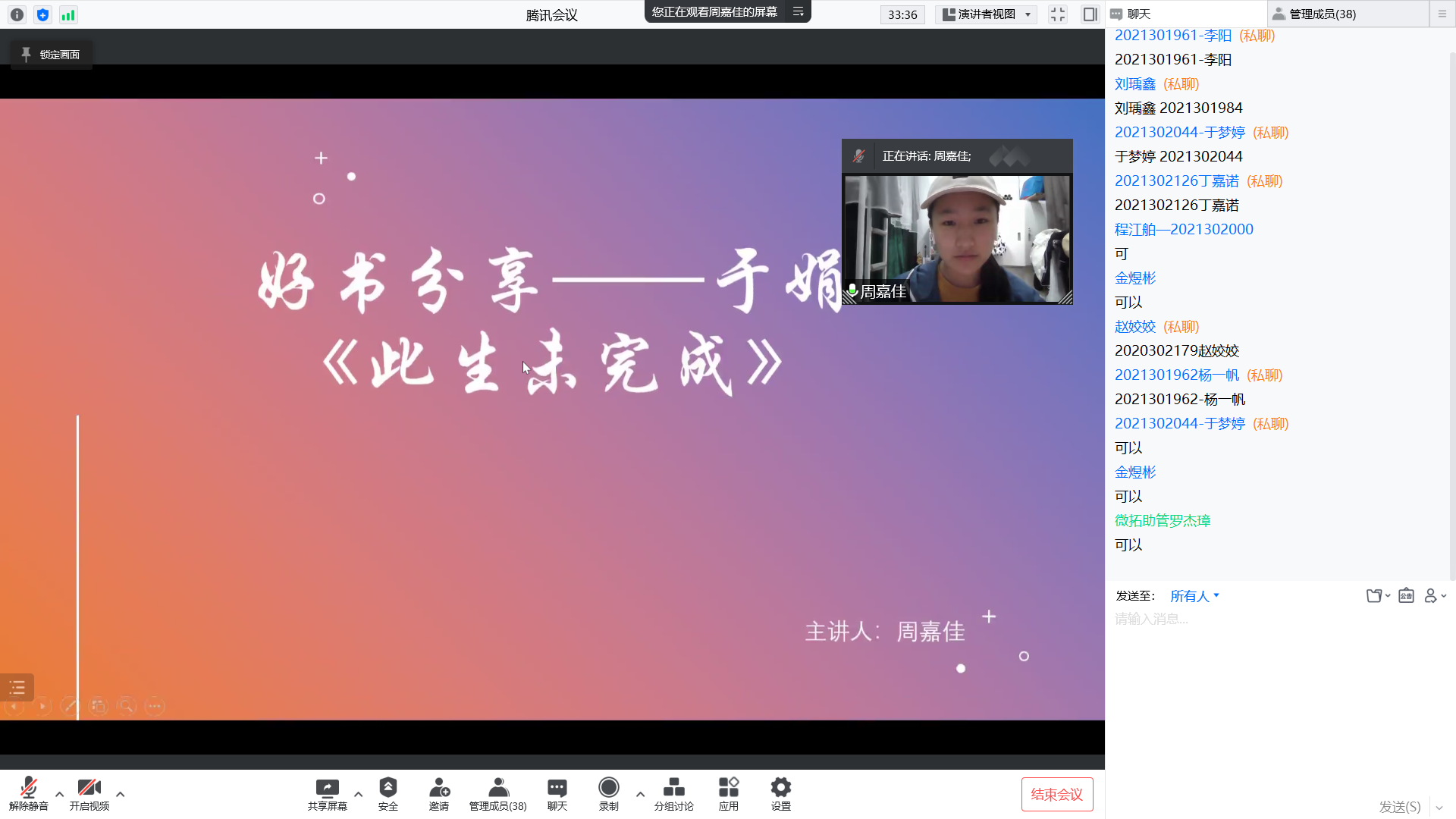 本期的微拓活动,主讲人周嘉佳介绍了作家于娟的《此生未完成》一书,用富有磁性的声音带领同学们品味书中的情节,结合主讲人自身的理解,浅析了书中蕴含的人生哲理,并与同学们一同讨论了书中的故事对于我们当下的生活的参考价值。通过这本自传,主讲人希望向同学们传递积极向上的生活态度以及规律生活的重要性。在整个活动过程中,同学们与主讲人积极互动,气氛热烈。讲座结束后,同学们纷纷表示收获颇丰。