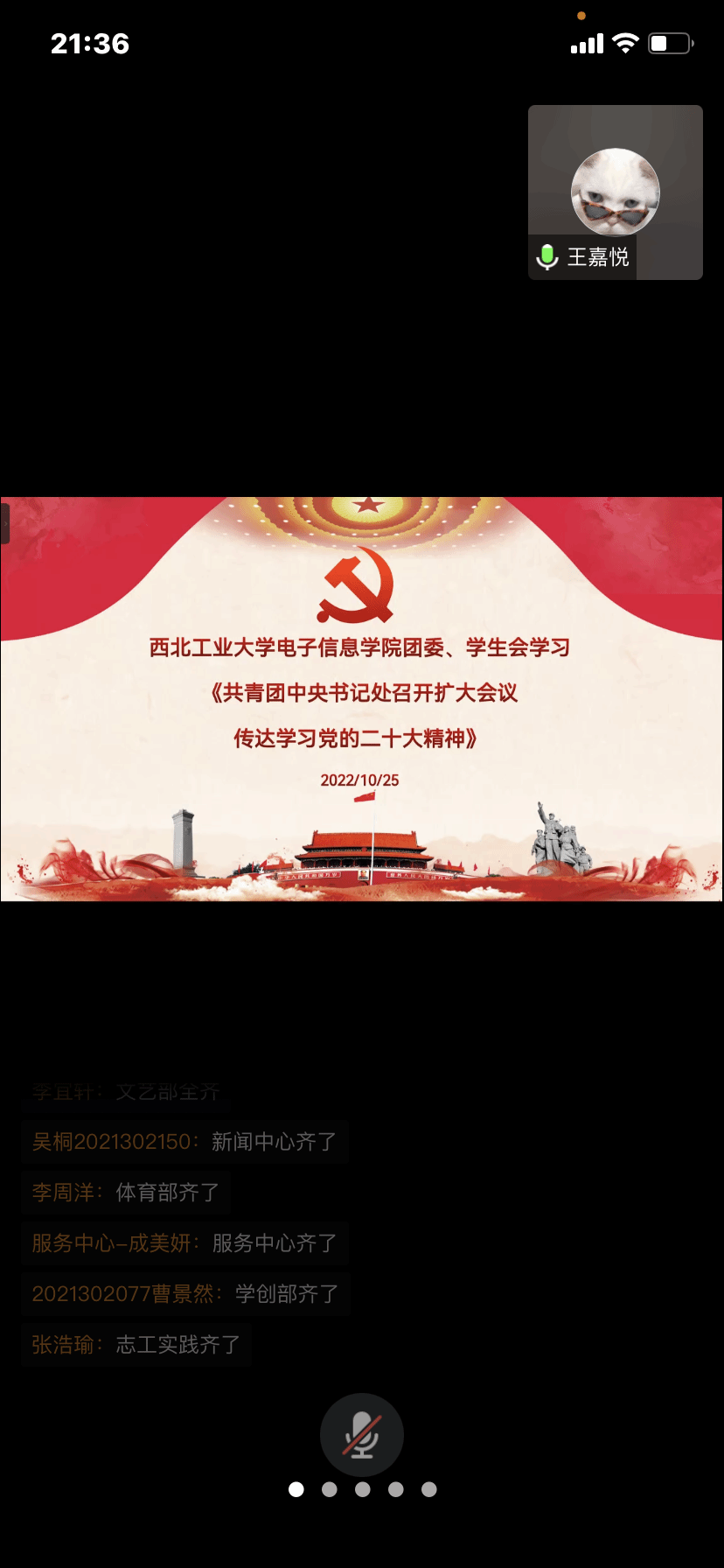 10月25日晚,电子信息学院团委、学生会召开线上专题会议,学习《共青团中央书记处召开扩大会议传达学习党的二十大精神》,团委书记王嘉悦参加会议并担任领学人,主席团及全体负责人参加学习。会议由执行主席祝嘉骏主持。