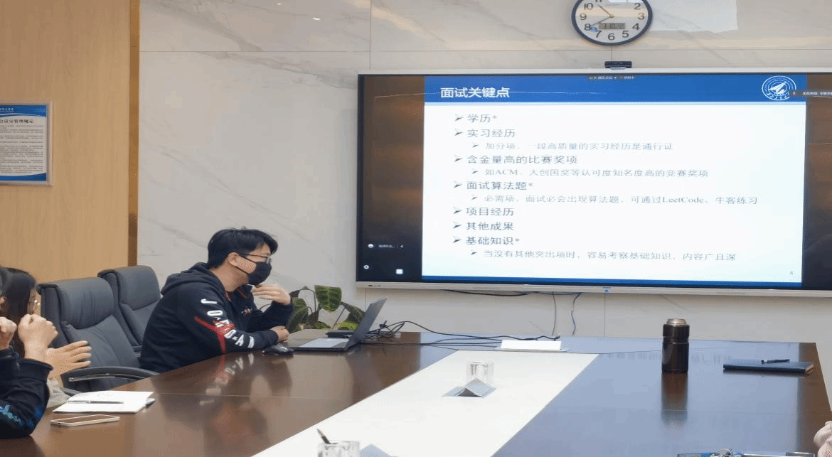 首先,就业助管高钰杰同学为大家介绍了学院23届研究生的整体就业情况,他使用统计数据分析了就业率、就业地分布、就业单位分布等情况。统计数据显示,23届毕业生的就业情况呈现就业意愿强,获签率高,研究所就业占比重,岗位与所学专业匹配度高等特点,这些信息极大鼓舞了21级同学的就业信心。