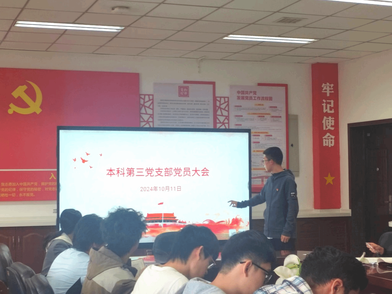 2024年10月11日,本科第三党支部召开党员大会,组织全体党员深入学习宣传中国共产党西北工业大学第十四次代表大会的报告,旨在深刻领悟会议精神,统一思想,明确方向,为推动支部的高质量发展贡献力量。本次党员大会由支部书记吴艺博主持,支部全体党员参加。