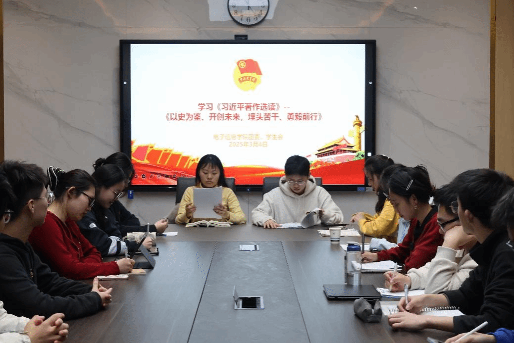 为深刻领会习近平新时代中国特色社会主义思想,明确发展方向,提升工作能力,电子信息学院团委、学生会开展3次《习近平著作选读》专题学习,会议由团委书记王嘉悦主持,团学骨干及部分志愿者参与学习。