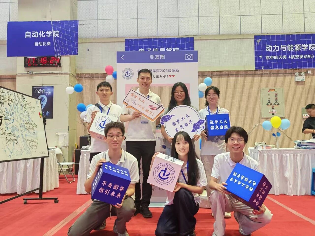 早在七月中旬,电子信息学院便启动迎新筹备工作,成立由院领导牵头的迎新专班,多次召开协调会细化流程,从报到动线设计到物资保障清单逐一敲定。迎新两天,学院专属迎新区域内,蓝白相间的展板清晰标注报到流程,“梦想从“电”开始,未来因“信”精彩” 的醒目标语,文化衫、鼠标垫、钥匙扣、帆布袋等学院专属小礼品让新生初入校园便感受到专业氛围。新生签名活动也吸引了众多学子的积极参与。硕大的签名板矗立在外场报到区中心,成为新生们踏入大学校园后第一个颇具仪式感的打卡点。新生们有序排队,满怀憧憬地拿起签字笔,在签名板上郑重留下自己的姓名。笔迹或工整清秀,或洒脱豪迈,每一个名字都承载着一个崭新的梦想和对未来四年的无限期待。