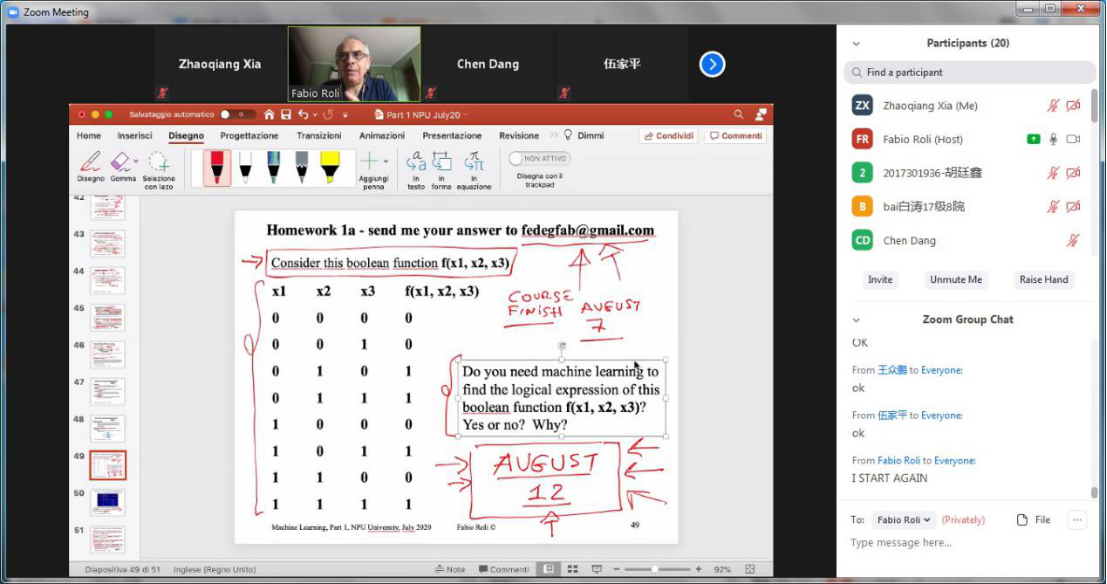 受电子信息学院冯晓毅教授的邀请,意大利卡利亚里大学PRA实验室主任Fabio Roli教授于2020年7月20日至8月7日,在我校“暑期国际学堂”活动中,在线讲授了Adversarial Machine Learning /对抗机器学习课程。我校共有30余名学生报名参加了该课程的学习(其中包括本科生、硕士生以及博士生)。在线授课期间,助教夏召强副教授协助Roli教授开展相关教学活动。