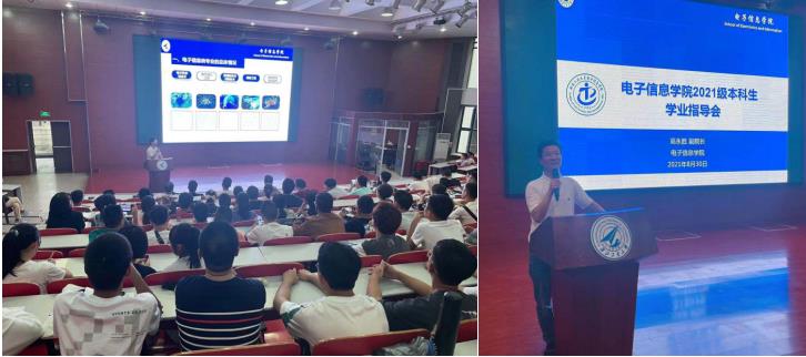 高永胜副院长从学科专业的角度为同学们介绍了电子信息学院五个专业以及电子信息类课程的设置,就2021级电子信息类培养方案中通识通修、学科专业课程设置做了详细讲解,着重给出了2021-2022学年秋季学期的选课建议,同时也对同学们寄予了厚望,希望同学们在未来四年的学习生涯中,胸怀理想、学有所长、奋发图强。