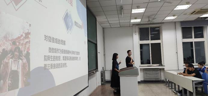 首先由团委书记王嘉悦向新生总体介绍电子信息学院团委、学生会的过往成绩。接着,电子信息学院团委、学生会下属的8个部门,新闻中心、组织部、服务中心、社会实践部、志工部、学创部、体育部及文艺部的各部门主讲人依次为大家介绍部门的职能和工作。他们用语言、文字、视频等多样的方式展示出部门的风采和文化,让新生感受到各个部门的独特氛围。