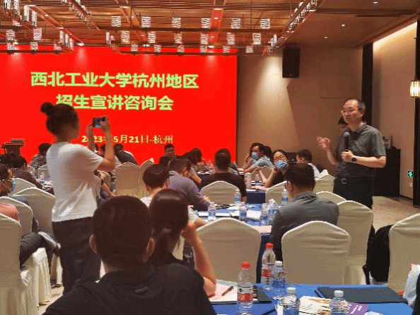 为进一步加大本科招生宣传工作的力度,提高杭州地区本科生录取数量和质量,2023年5月21日,浙江招生组携手我校多个学院,在杭州纳德世家酒店举办了2023年杭州招生政策宣讲咨询会。宣讲会由浙江招生组组长、电子信息学院副院长高永胜主持,航海学院党委书记孙华强,航空学院副院长万方义、材料学院副院长王永欣、玛丽女王工程学院副书记程茵、校招办姚远老师、浙江招生组部分老师、杭州校友会常务副会长邓方涛、副会长向华安等杭州校友会代表、杭州地区120多位意向西工大的考生家长全程参与本次宣讲咨询会。