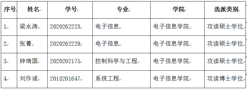 根据“国家留学基金委-赴莫斯科航空学院公派项目”的遴选要求,电子信息学院组织开展了申报工作。经个人申报,学院审核推荐,确定了入选者名单。现予以公示,公示期自2021年2月28日至3月4日,如有异议请实名向学院办公室反映,联系电话:88431208。