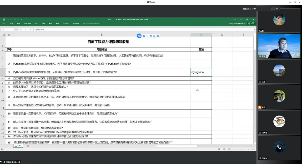 11月5日晚,在《Python程序设计》课堂,百度金牌讲师、百度智能云资深研发工程师章淼博士就专业能力提升、未来行业发展、学生职业发展规划等相关问题进行了在线授课和答疑,70多名学生参与聆听。电子信息学院副院长高永胜、百度技术培训中心校企合作负责人宋大伟、《Python程序设计》课程主讲教师张顺参加了本次活动。