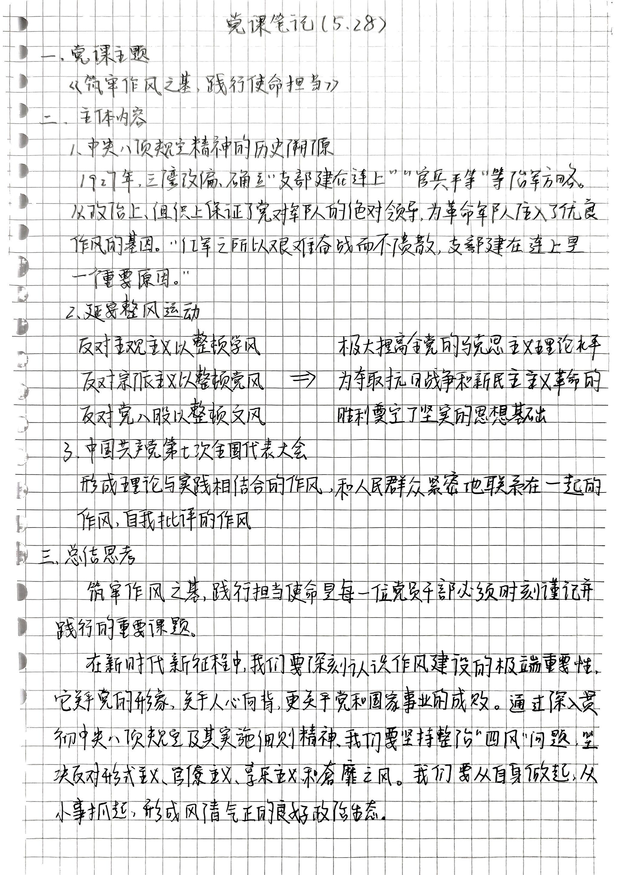 各位学员围绕学校第十四次党代会精神、总师育人文化、中央八项规定精神相关内容进行专题研讨,从课程学习、专业实践、日常行为等维度出发,聚焦提升“总师型”人才雏形特质能力、在学习生活中践行廉洁准则等,认识到要始终以严于律己的态度,将个人成长与国家发展同频共振,用青春热血为强国建设添砖加瓦。研讨期间,同学们结合教学内容、专业方向和成长经历,分享感悟、明确目标、规划举措,在热烈讨论中感悟党的精神内核,树立勇担时代重任的远大志向。