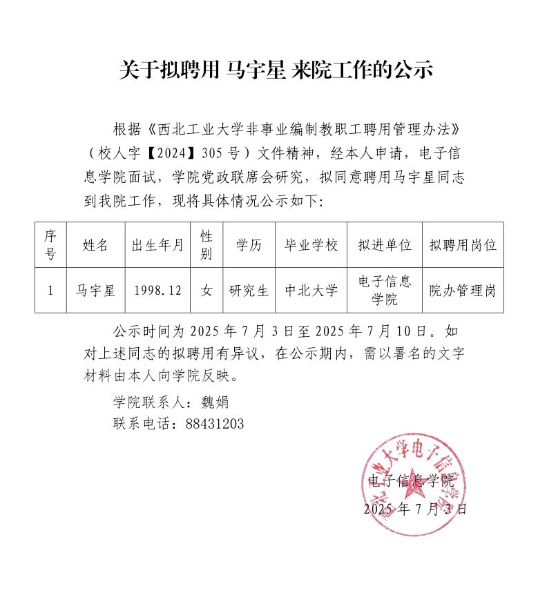 关于拟聘用 马宇星 来院工作的公示