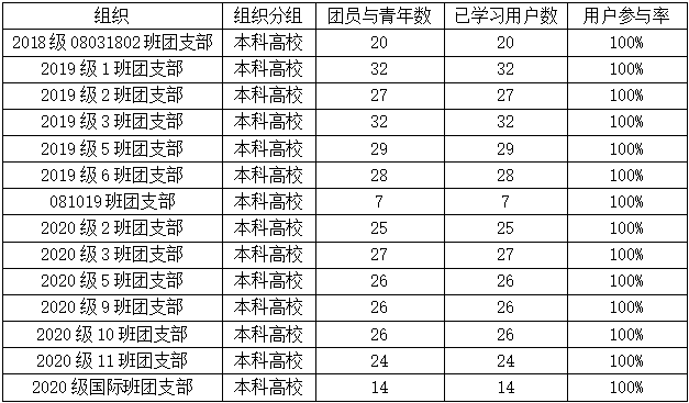 在本期学习中,本科支部2018级较上期学习完成率有所提升,2019级学习完成率较上期保持一致;其中,共有14个班级支部学习完成率达100%,分别是:2018级08101802班,19级1、2、3、5、6班和国际班(081019班),2020级2、3、5、9、10、11和国际班,在此对这些团支部提出表扬!