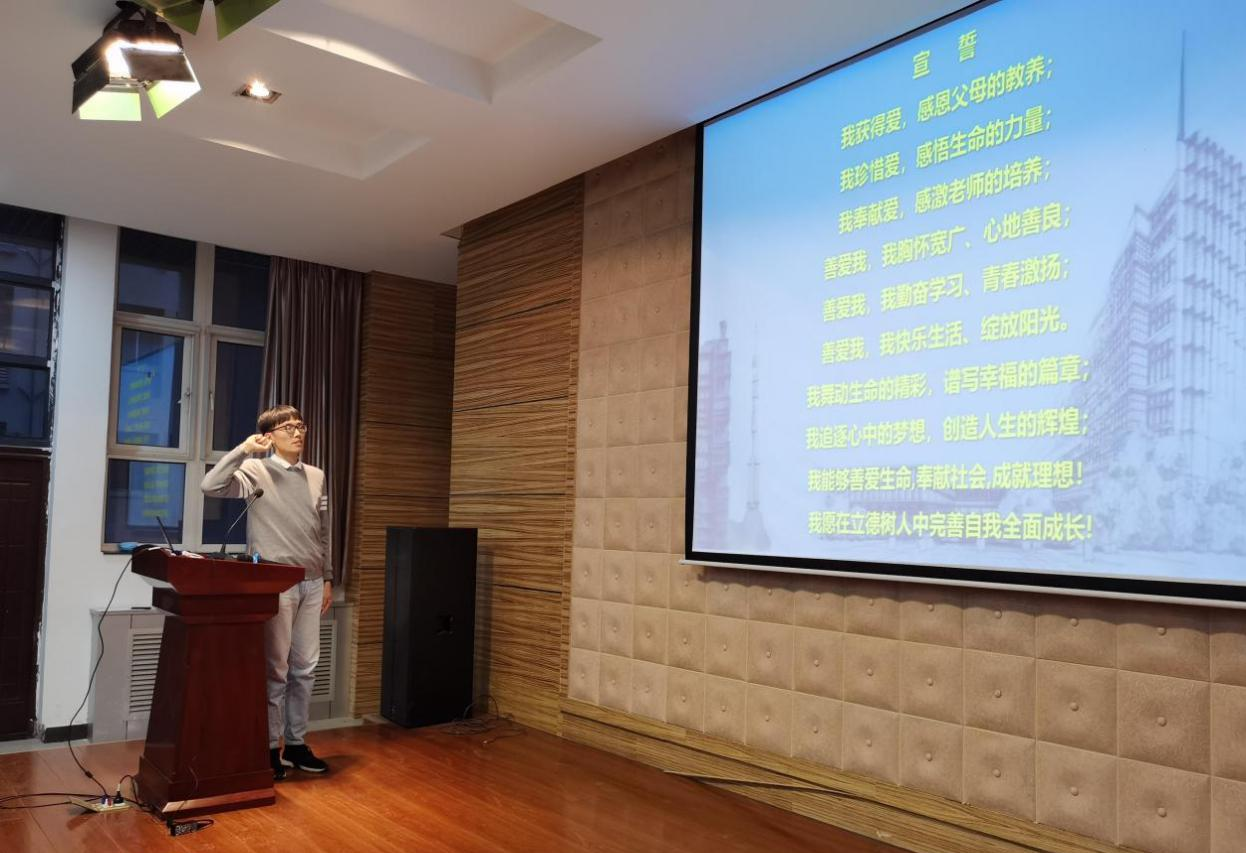 研究生刘恒宇,讲述了他在担任“知心阁”心理辅导站骨干及班级心理委员的两年中的收获与感悟,并领誓,在立德树人中完善自身的全面成长。
