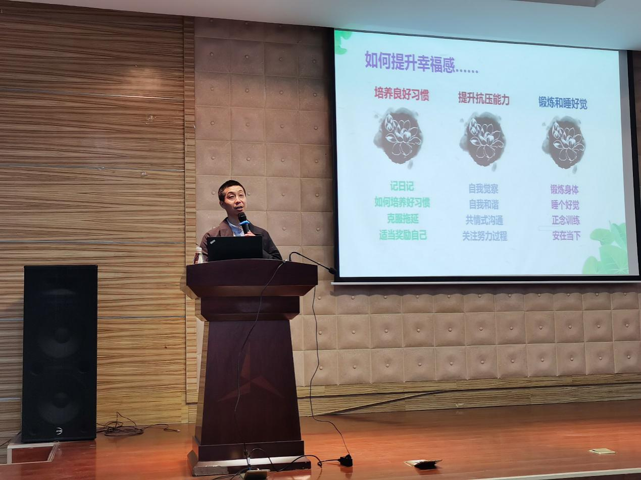 2021年心理育人宣传季活动正式开始。本届心理育人季的首场讲座拉开序幕,由陕西省人民医院心理科主治医师宋东峰老师带来《追梦的你,幸福在哪里》主题讲座。宋东峰从不同的角度向讲述了幸福是什么,并且从心理学的角度介绍了什么是幸福,如何获得幸福感,鼓励大学生应当培养良好习惯,提升抗压能力,适当锻炼等,都有助于提高幸福感。宋东峰以诙谐幽默的语言和积极的现场互动,为大家介绍了正念减压的方法,并带领大家完成了一次“催眠”练习,缓解了大家的紧张感和疲惫感,让大家沉浸在这场生动的讲座中。宋东峰老师建议,要获得幸福,就要学会包括家庭、师生、同窗之间的沟通,以此释放自己的心理压力,获取情感共鸣。