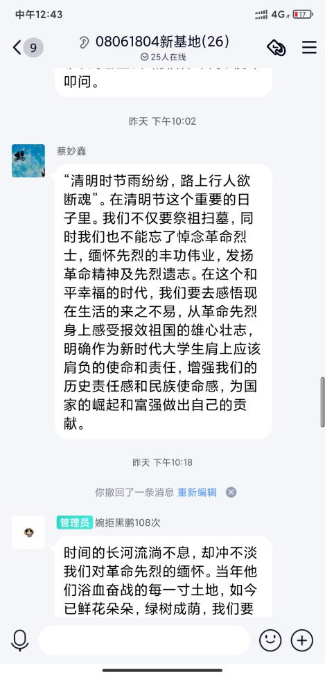 电信三班的同学们在清明假期期间号召积极参与“西工大网上清明祭奠英烈活动”,书写致敬寄语,表达对革命英烈的缅怀与敬仰,并在线上集体观看英烈纪录片《龙华的去年今日》1-2集,鼓励同学们积极寻找和分享英烈感人事迹,共同学习英烈的伟大精神与崇高品质。