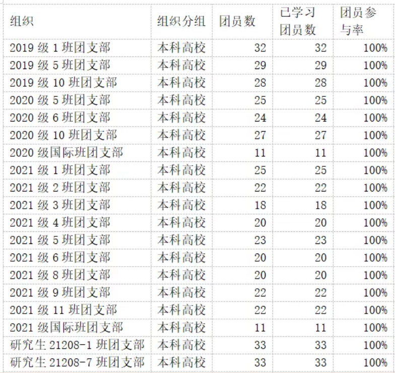 然而,仍存在许多班级完成率仍低于50%,极个别班级完成率低于20%,如研究生20208-1团支部、研究生19208-6团支部、研究生19208-1团支部、2018级08061805班团支部、2018级08061809班团支部、2018级08061804班团支部,希望这些班级在之后的学习中能够提高学习积极性,向完成率较高的团支部汲取经验,按时完成学习任务。