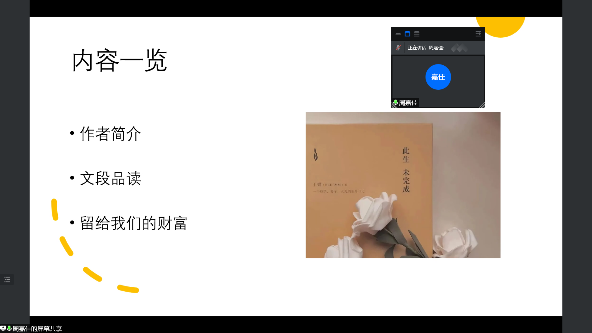 4月15日晚上,由我校党委学工部主办,电子信息学院承办的“微拓”-WE TALK学术沙龙第150期通过线上会议的形式举行。本次活动主题为“好书分享—于娟《此生未完成》”,主讲人周嘉佳是电子信息学院2020级本科生,曾获国家励志奖学金、校二等奖学金以及社会服务先进个人、学业先进个人、“优秀共青团员”等荣誉表彰。