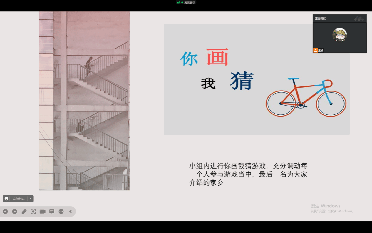 活动伊始,主持人带领同学们进行自我介绍,包括自己的家乡、专业、爱好等,使同学们互相了解。七班同学分成五个小组进行游戏,第一个游戏环节是“你画我猜”。同学们分组作战,根据提前设定好的关键词,选定一人根据关键词作画,其余队员猜关键词,若猜对则作画同学加一分,每组五幅画,得分最低的同学需向大家介绍自己的家乡。作画过程中由于设备限制,出现不少灵魂画手,游戏过程中笑声不断。