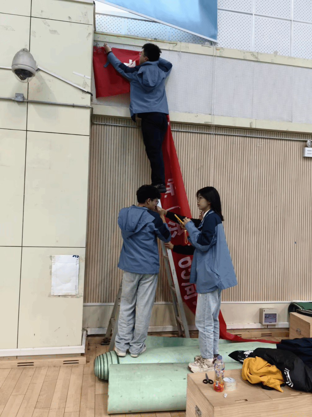 图为志愿者合作悬挂横幅