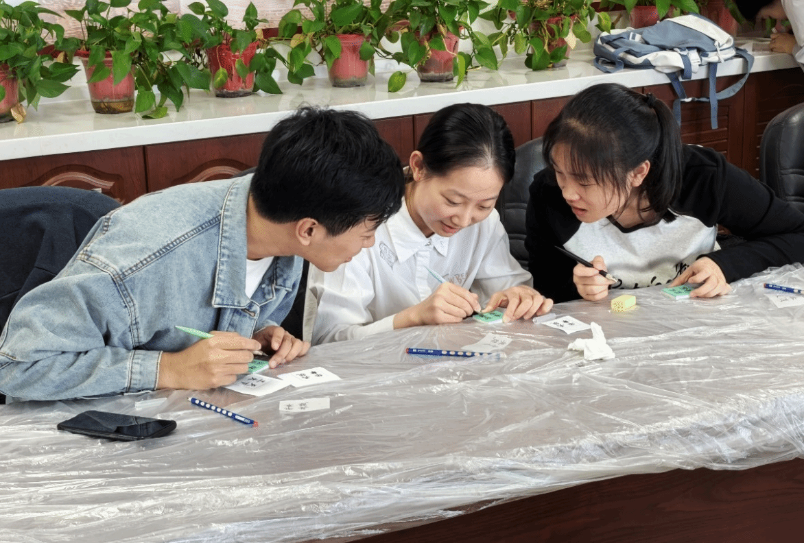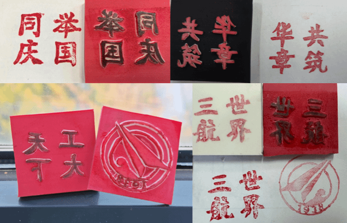 学生雕刻协会负责人王皓然讲授橡皮章雕刻技巧。王皓然同学从制作实践出发,深入浅出地讲解了雕刻的基本原理、执刀手法、雕刻技巧等内容,并以“中”字为例为同学们演示雕刻过程,并鼓励大家要科学操作,也要敢于实践。随后,同学们按照讲解内容进行练习体验,利用橡皮章刻制了“共筑华章”“盛世中华”“国泰民安”“天下工大”“世界三航”等内容。