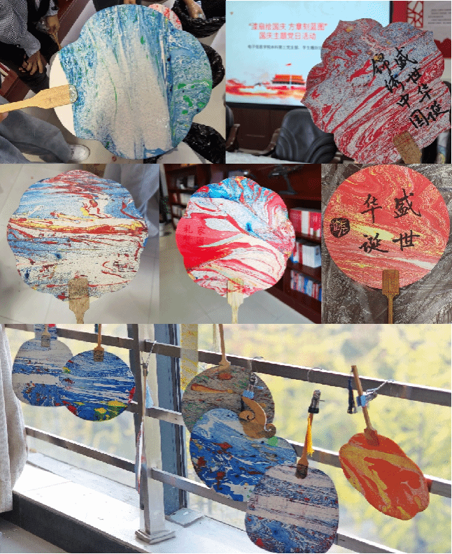 雕刻体验活动结束后,大家开始了漆扇体验活动。大家按照自己的构思将不同颜色的漂漆混合在水中,有的以红色和黄色为主题色,构筑国泰民安、欣欣向荣的盛世画卷,表达对祖国繁荣、人民幸福的美好祝愿;有的则以蓝色为扇面主题色,紧扣Ai色情