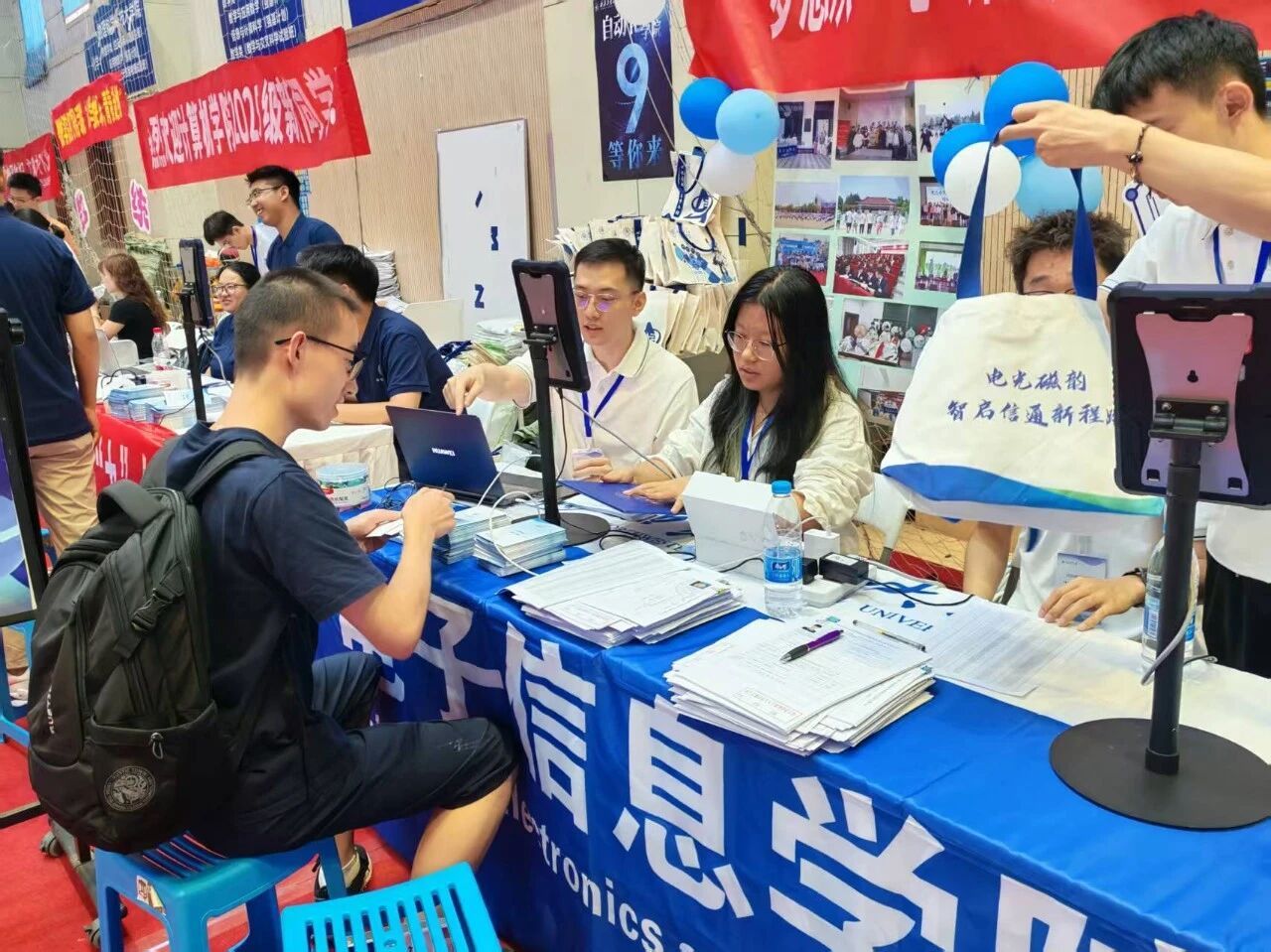 便启动迎新筹备工作,成立由院领导牵头的迎新专班,多次召开协调会细化流程,从报到动线设计到物资保障清单逐一敲定。迎新两天,学院专属迎新区域内,蓝白相间的展板清晰标注报到流程,“梦想从“电”开始,未来因“信”精彩” 的醒目标语,文化衫、鼠标垫、钥匙扣、帆布袋等学院专属小礼品让新生初入校园便感受到专业氛围。新生签名活动也吸引了众多学子的积极参与。硕大的签名板矗立在外场报到区中心,成为新生们踏入大学校园后第一个颇具仪式感的打卡点。新生们有序排队,满怀憧憬地拿起签字笔,在签名板上郑重留下自己的姓名。笔迹或工整清秀,或洒脱豪迈,每一个名字都承载着一个崭新的梦想和对未来四年的无限期待。