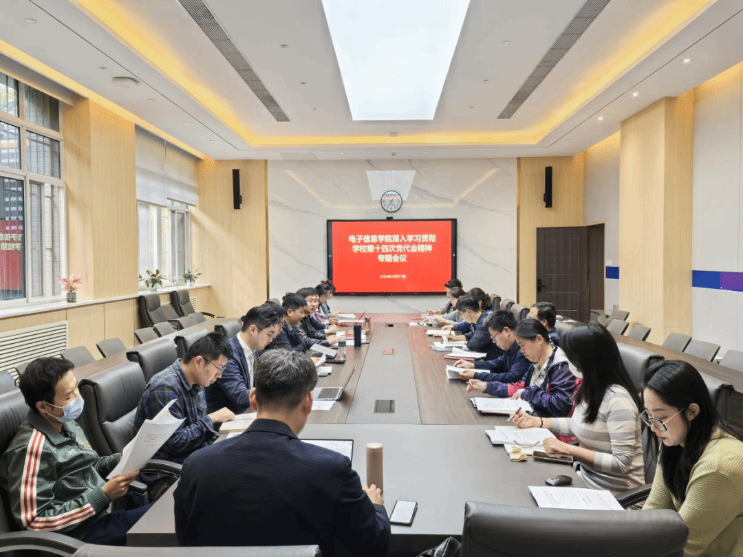 10月11日上午,电子信息学院组织召开专题会议传达学习学校第十四次党代会精神,研究部署贯彻落实举措。学院班子成员、党委委员、院长助理、教工党支部书记及系(副)主任参加会议,会议由学院党委书记侯俊主持。