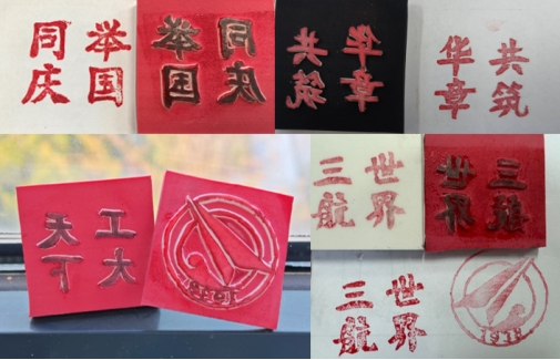 学生雕刻协会负责人王皓然讲授橡皮章雕刻技巧。王皓然同学从制作实践出发,深入浅出地讲解了雕刻的基本原理、执刀手法、雕刻技巧等内容,并以“中”字为例为同学们演示雕刻过程,并鼓励大家要科学操作,也要敢于实践。随后,同学们按照讲解内容进行练习体验,利用橡皮章刻制了“共筑华章”“盛世中华”“国泰民安”“天下工大”“世界三航”等内容。