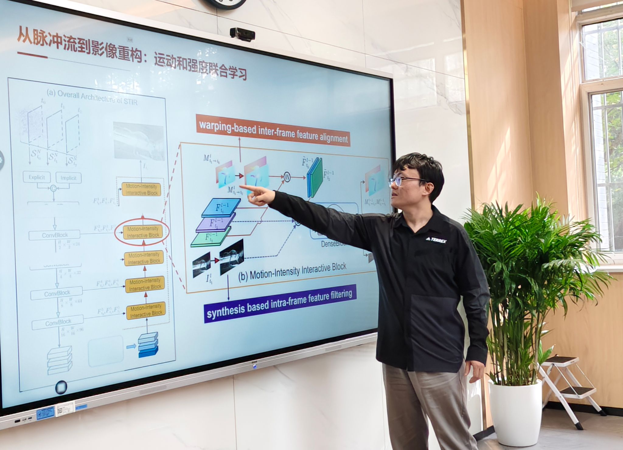 报告中,樊斌教授系统介绍了神经形态脉冲相机在动态场景影像重构中的创新工作。该相机凭借高速、高动态范围的特性,为传统成像瓶颈提供了新解决方案。团队通过挖掘脉冲流中的时空线索,对强度与运动信息进行渐进式联合学习,实现了2000FPS视频的实时高精度重建;同时,设计的多比特脉冲滚动读出机制,兼具高位深和高效读出优势,解决了高速高动态范围视频重构的关键难题。研究涵盖了从成像原理、核心算法到实际应用的完整体系。