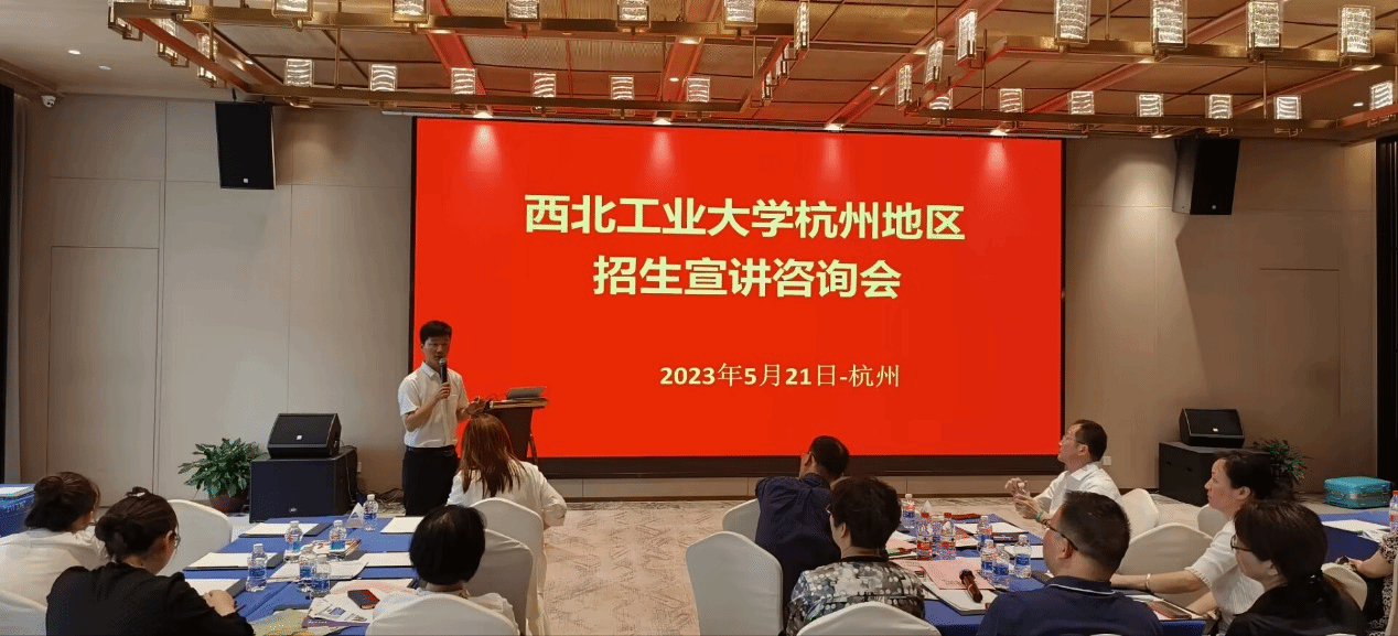 为进一步加大本科招生宣传工作的力度,提高杭州地区本科生录取数量和质量,2023年5月21日,浙江招生组携手我校多个学院,在杭州纳德世家酒店举办了2023年杭州招生政策宣讲咨询会。宣讲会由浙江招生组组长、电子信息学院副院长高永胜主持,航海学院党委书记孙华强,航空学院副院长万方义、材料学院副院长王永欣、玛丽女王工程学院副书记程茵、校招办姚远老师、浙江招生组部分老师、杭州校友会常务副会长邓方涛、副会长向华安等杭州校友会代表、杭州地区120多位意向西工大的考生家长全程参与本次宣讲咨询会。